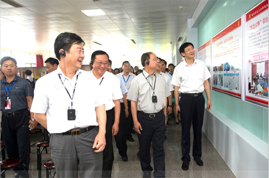 ↑凱馬汽車黨委書記、總經(jīng)理董宜順陪同各級(jí)領(lǐng)導(dǎo)參觀凱馬汽車生產(chǎn)車間